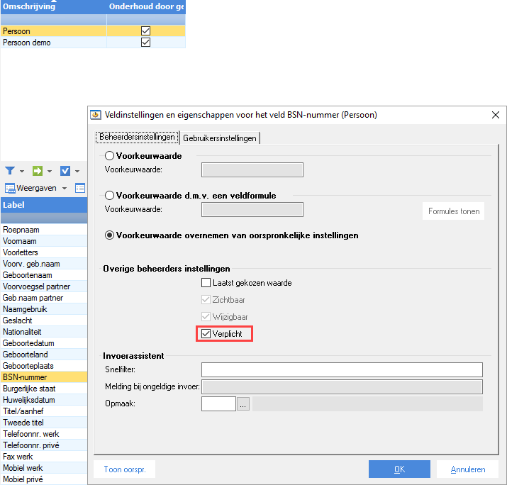 Het veld BSN-nummer bij het indienst melden is vanaf nu standaard verplicht. De verplichting kan je eraf halen door dit via de context Persoon op het betreffende profiel aan te geven.