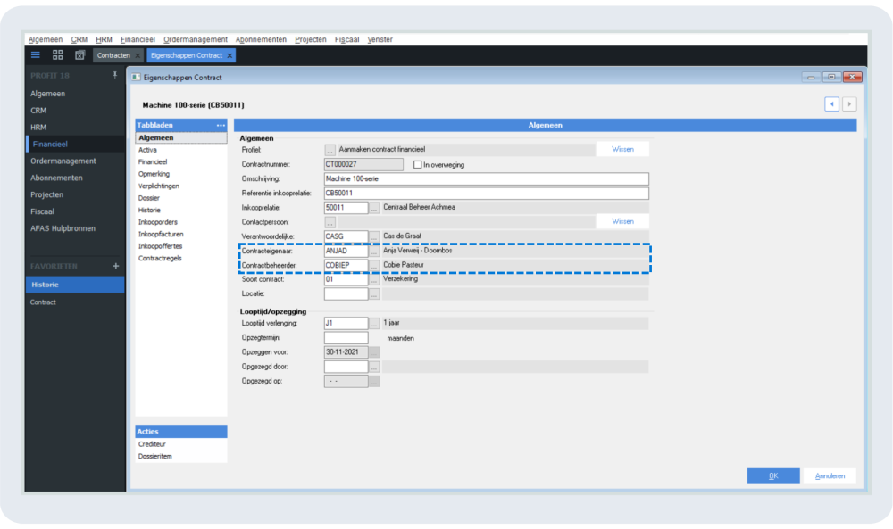 The Contract owner and Contract manager fields have been added to the contract so that you can define several roles/persons on a contract in addition to the existing Responsible person field. You can use it as a possible destination in the Financial contract workflow.