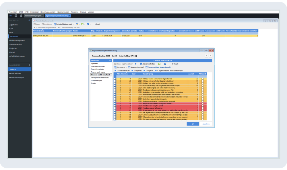 The financial period closing is an important proc4ess with fixed steps that you need to complete before and after the end of the period. Examples include suspense account reconciliation, work in progress, VAT checks, connecting debtors/creditors, current account ratios, etc. You can fully safeguard this now in Profit with a period closing. This includes a script, audit lines (of the Finance Auditor), workflows and deferred items. You can clear your to-do list: everything will now be in Profit.